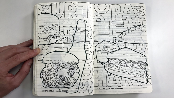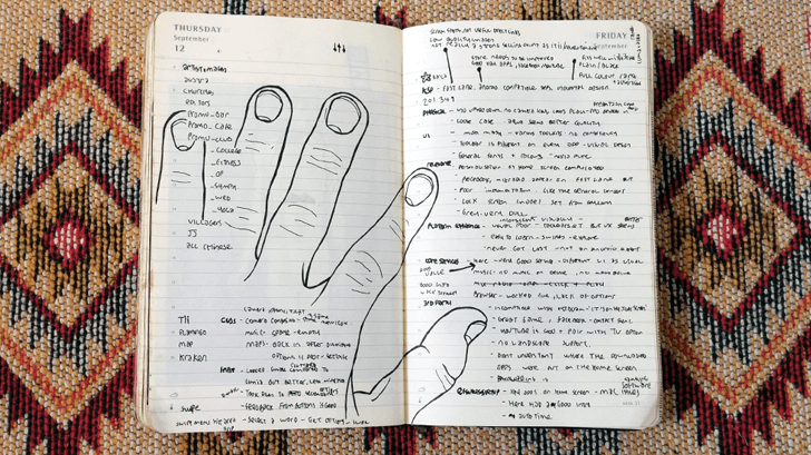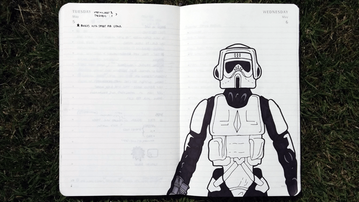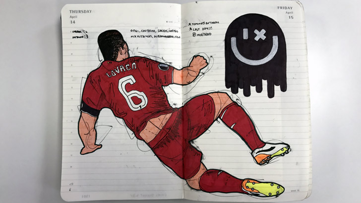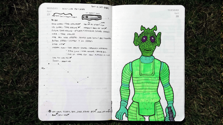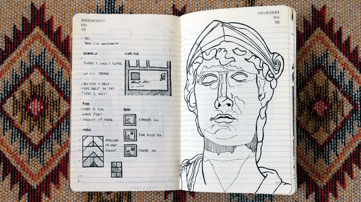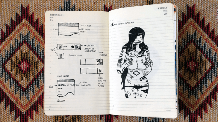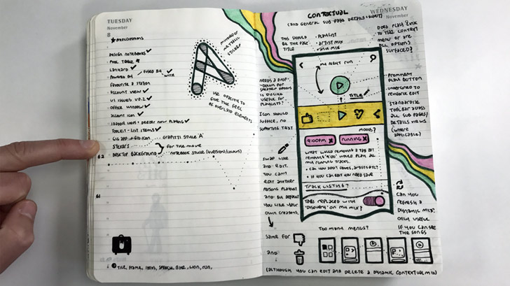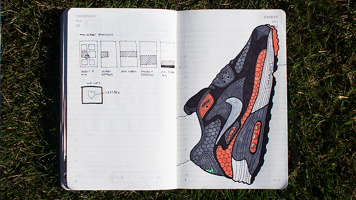 Every year I fill a Moleskine daily planner diary, mostly with work but it is also a scrapbook and collection of nonsense. From UX flows and UI concepts through to sketches of my trainers.