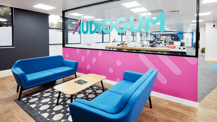 The entrance to the Audiogum office. I used the bright colours in key places around the space, too much would have been headache inducing. The shapes within the pink area are expanded from the 'A', where the lines and dots interact. This pattern was used throughout the office and on printed materials.