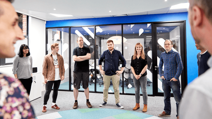 Daily standup. Notice the repeated shapes on the meeting room windows.
