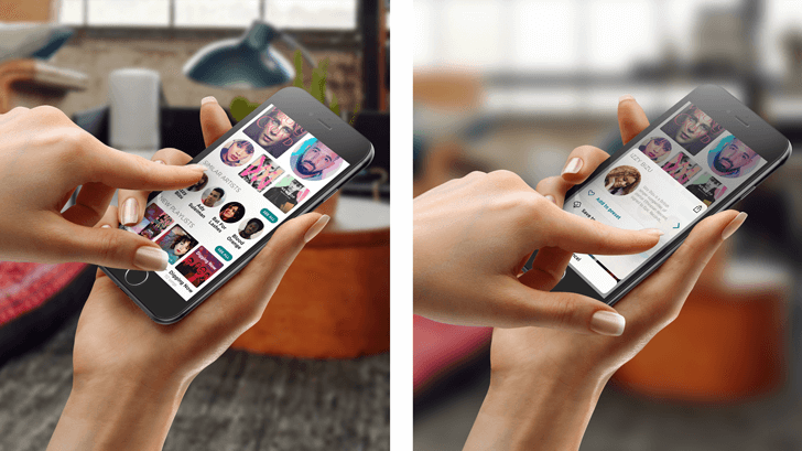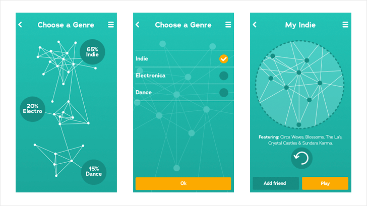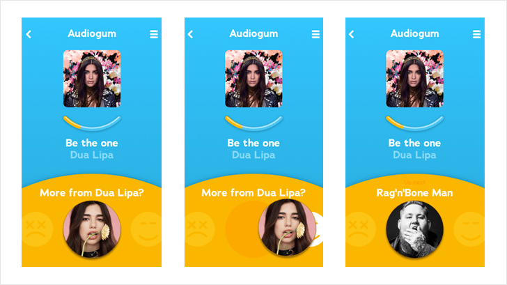 This quick concept steals the swipe from Tinder to say whether you like the displayed artist or not. Your playlist updates based on each like or dislike. The player duration bar is curved like a smile.