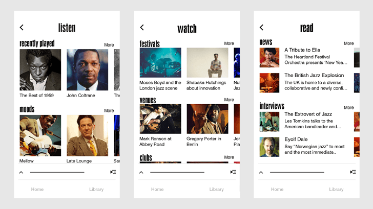 Jazzed was a great project to work on with a really dedicated and knowledgeable team. I was involved relatively early on and had the chance to create concept designs and really think how the app could be more than just a Spotify for Jazz. The initial concepts revolved around making use of the world of Jazz and enabling new fans of the genre to easily discover new artists based on their current tastes.